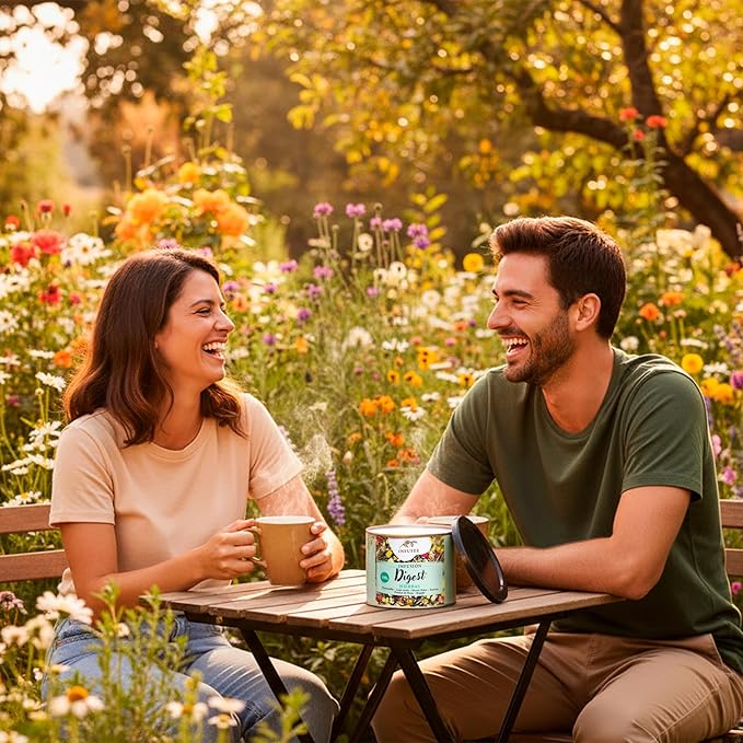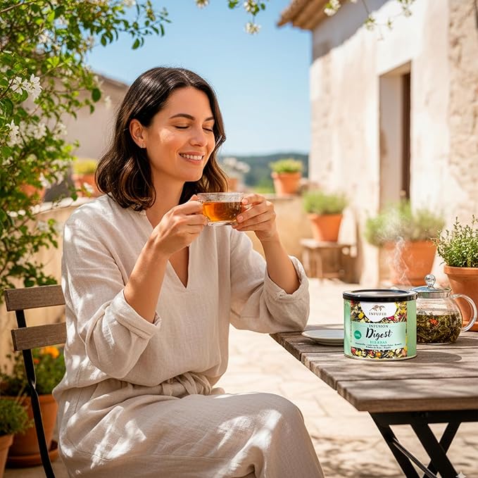 La manzanilla calma, el anís verde aligera, la menta poleo refresca, el romero despierta, los pétalos de rosa suavizan y el regaliz aporta ese toque dulce que abraza. Cada sorbo es un respiro, una caricia tibia que reconforta el estómago y trae a la memoria los remedios caseros que siempre funcionaban.